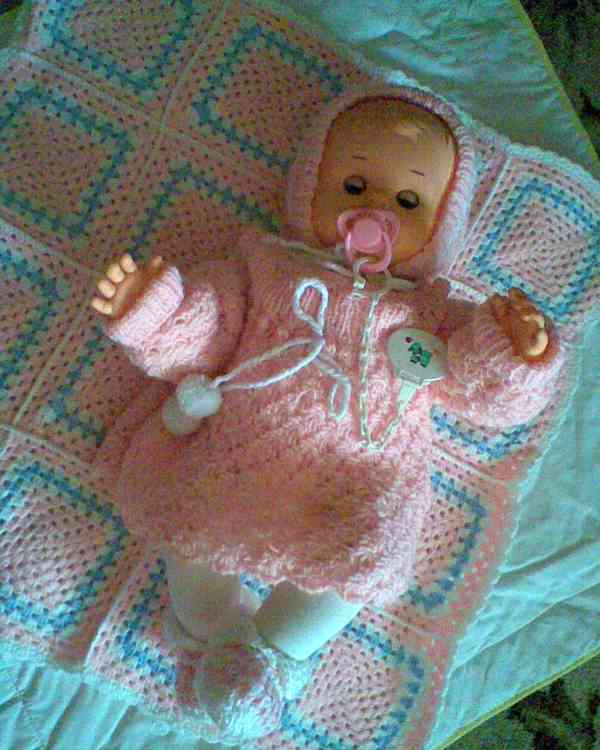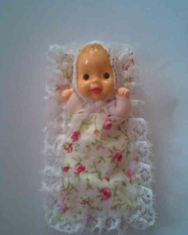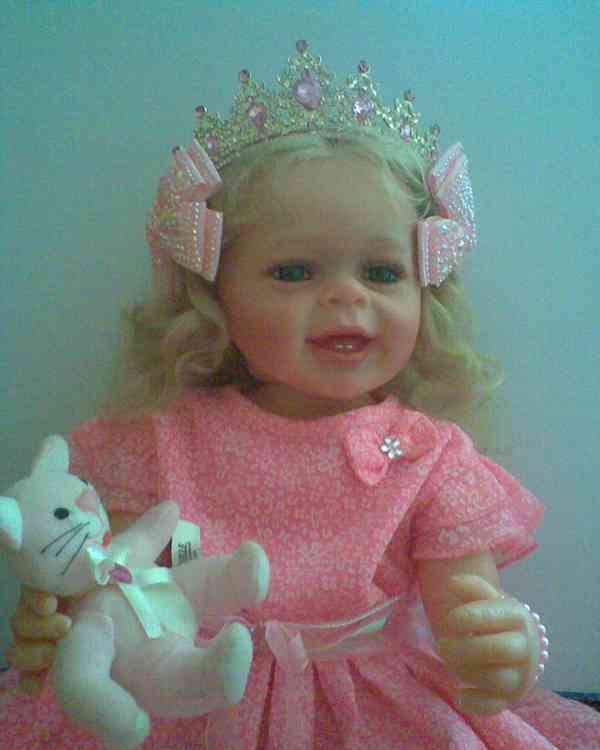 krásná nová panenka v růžovém oblečení a botičkách, má i další na převlékání, kromě toho má deku, dudlík, lahvičky, chrastítko, semišovou kočičku, sponky, gumičky, hřebínek, korunku kterou může nosit i holčička která dostane tuto nádhernou panenku,