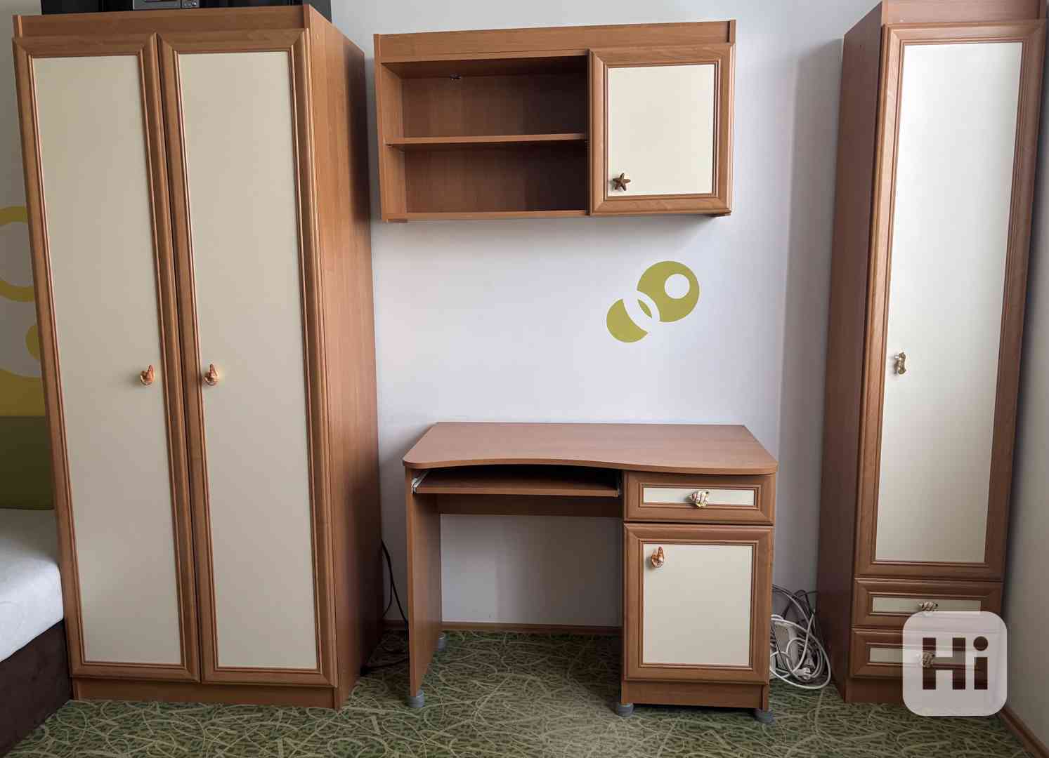 Velmi zachovalá 5-dílná sestava do dětského pokojíčku. Sestava se skládá z jedné větší šatní skříně, jedné větší skříně s poličkami, psacího stolu, menší vysoké skříně a malé nástěnné skříňky/poličky.