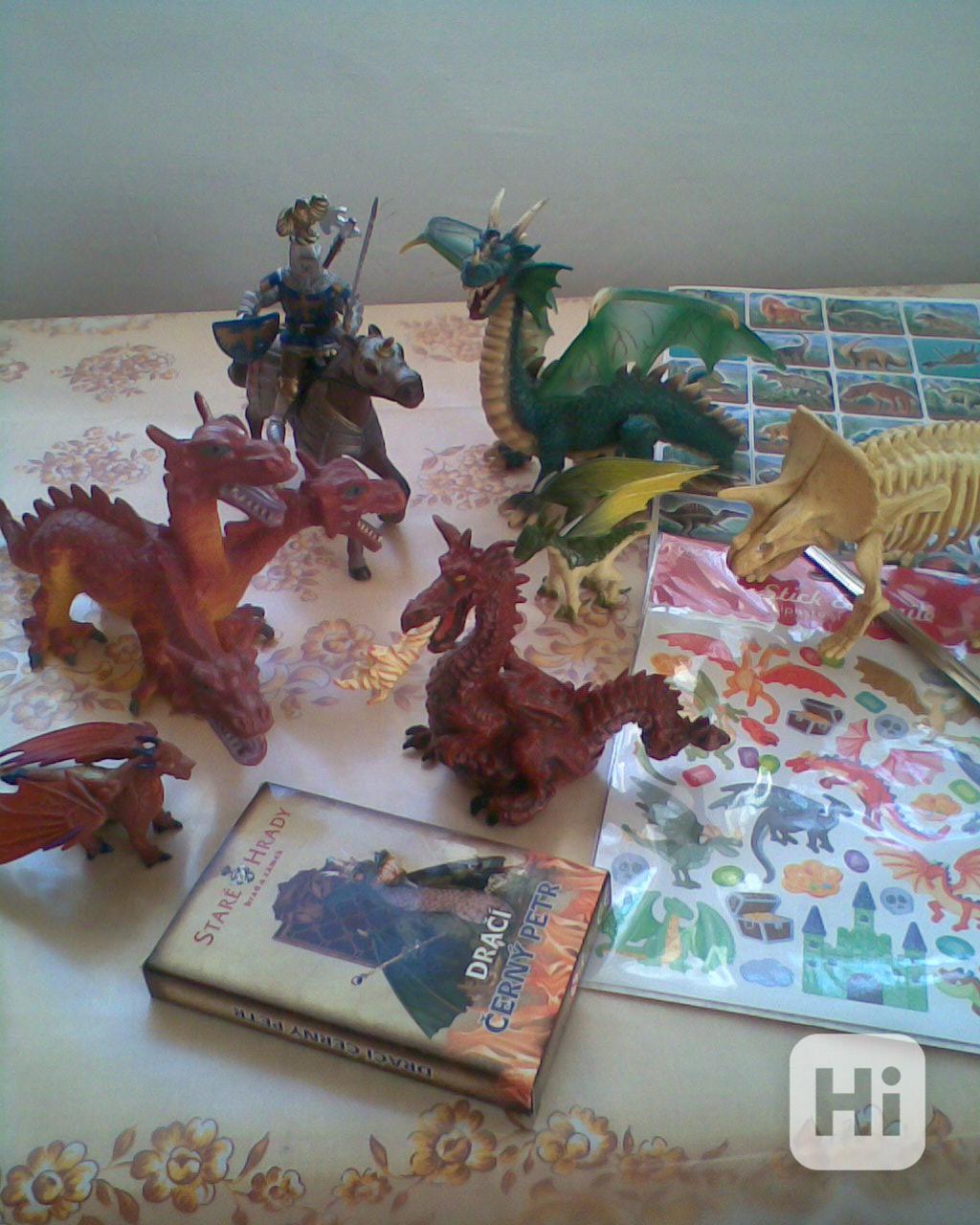 draci s dráčky, dinosaurus, rytíř na koni, pexeso, kvarteto, možno jednotlivě: tříhlavý drak s dráčkem a kvarteto draci 670,- drak s plamenem a rytíř na koni 690,- zelený drak s dráčkem a dinosaurem a pexeso 1140,- samolepky 120,- drak klipáček 100,- mečík neboli na otvírání dopisů asi 20cm 350,-