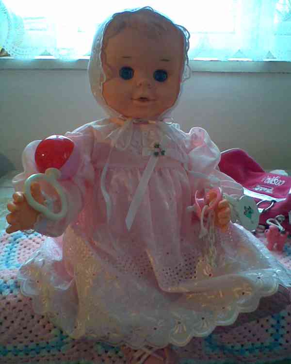 krásná nová panenka v růžovém oblečení a botičkách, má i další na převlékání, kromě toho má deku, dudlík, lahvičky, chrastítko, semišovou kočičku, sponky, gumičky, hřebínek, korunku kterou může nosit i holčička která dostane tuto nádhernou panenku,