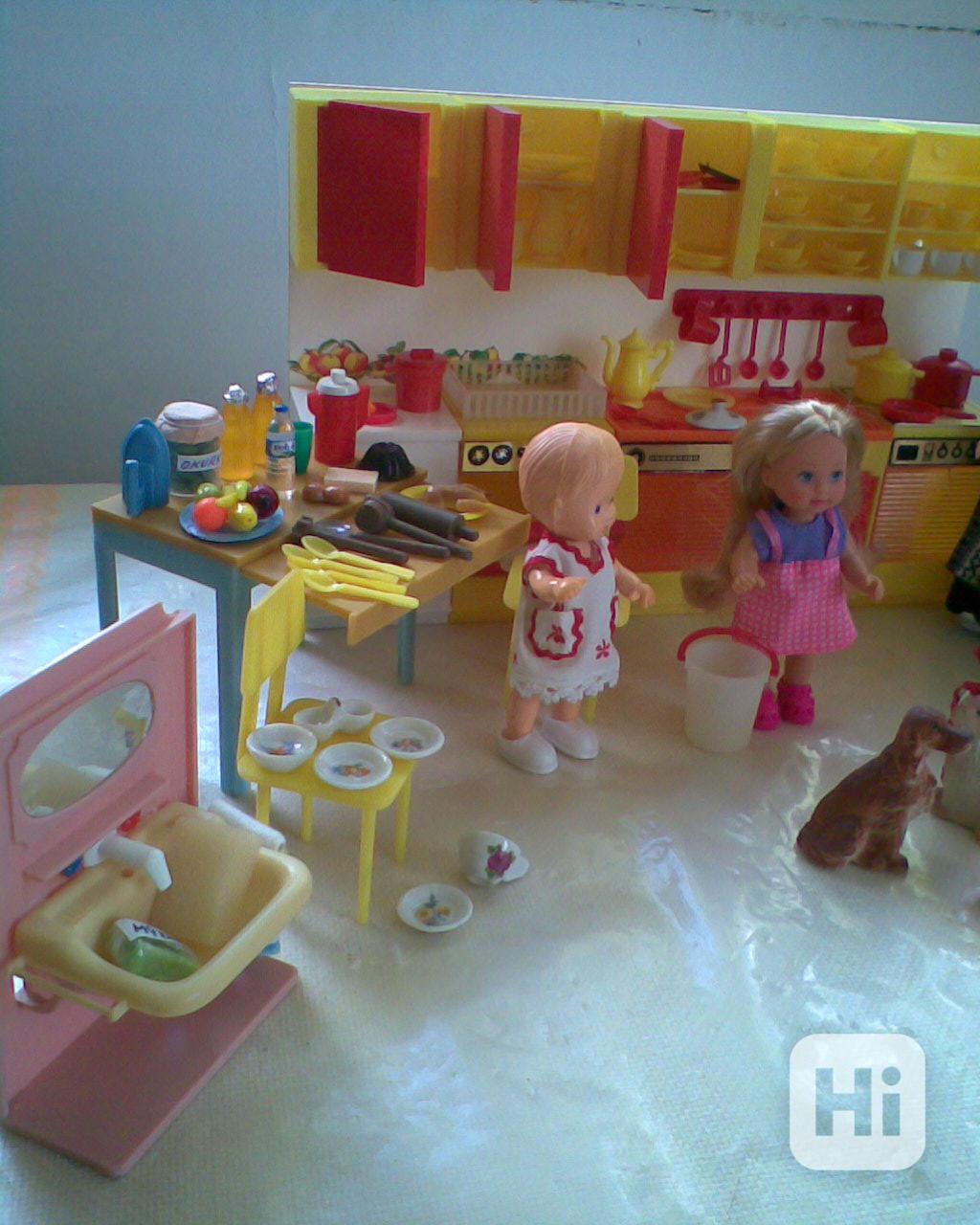kuchynka s nádobíčkem, různé doplnky, potraviny, sedačka, panenky mrkací dvě Igra, Evička, pejsci a kočičky, vana a umyvadlo, kočárek