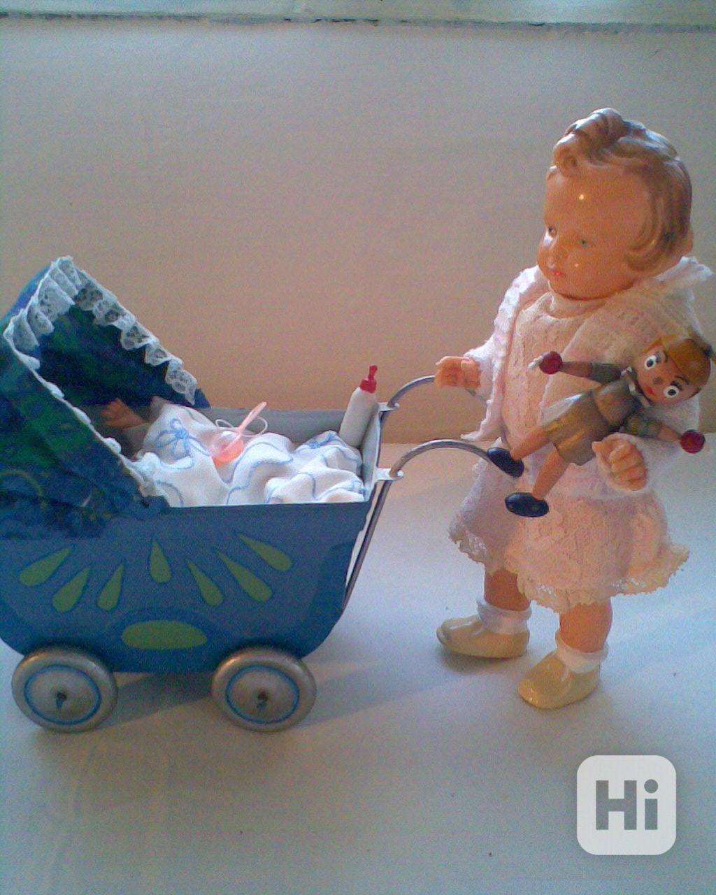 retro kočárek s panenkami a postýlka, za odkoupení další kočárek zdarma