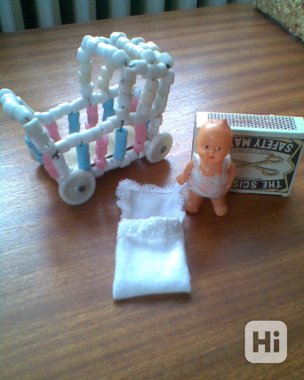 retro dvě mini celuloidní panenky jedna v korálkovém kočárku a druhá jako ve skořápce ořechu ale není je to nějaký tvrdý papír lisovaný, Andílek