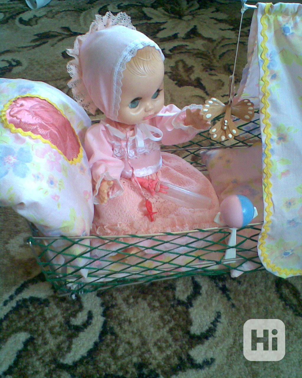 mrkací panenka v nově ušitém oblečení, má dudlík, chrastítko, lahvičku, postýlka s peřinkami, baldachýnem který lze oddělat s dřevěnou vyřezávací holubičkou