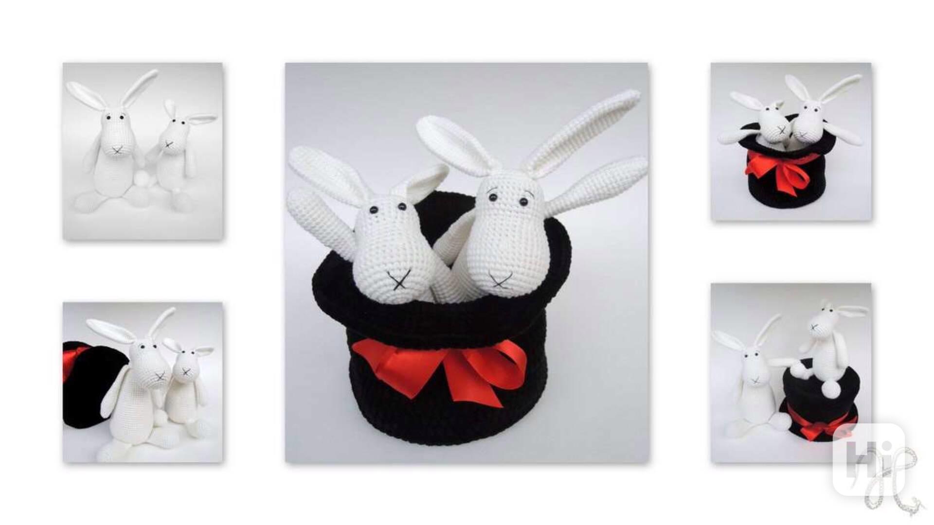 Ručně háčkovaní Bob a Bobek i s kloboukem. Na výšku mají 34 a 32 cm, vycpaní dutým vláknem a očička mají bezpečnostní. Dají se prát na 30.