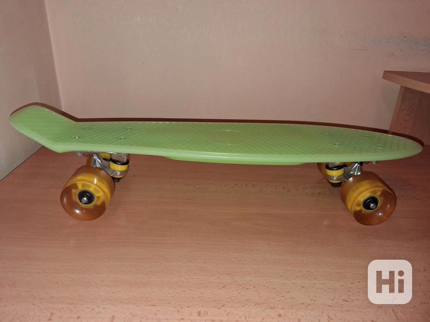 Prodám dětský skateboard světle zelené barvy, rozměr 57 × 15 cm. Kolečka při rotaci svítí barevnými LED diodami, prkno je fluorescenční a svítí ve tmě. Plně funkční, dobrý stav.